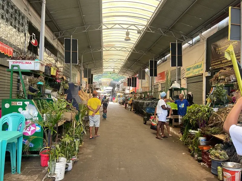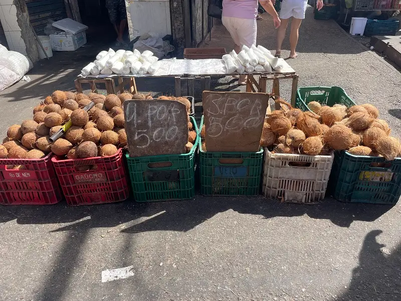Walking through the São Joaquim Market was a feast for our eyes- full of undiscovered fruits, vegetables, seafood, and herbs important to the candomblé religion practiced by the majority of people in Bahia. Settled on the port, walking through this market, you can find the ingredients to all the best traditional Bahian dishes like acarajé and moqueca, both characterized by their use of dendê oil and seafood from the bay. We watched coconuts be turned into powder for homemade coconut milk. We also learned about the use of beads and herbs to cleanse oneself and honor the orixás of candomblé—a syncretic religion combining African tradition with Catholic beliefs.