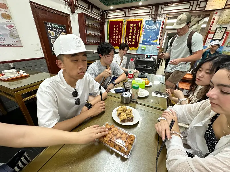 Enjoying 小吃 (xiǎochī – local snacks) with our teachers during the class excursion to the 四合院 (sìhéyuàn – traditional courtyard residence) in Beijing. Tasting these common snacks from the area added a delicious and cultural dimension to our visit.