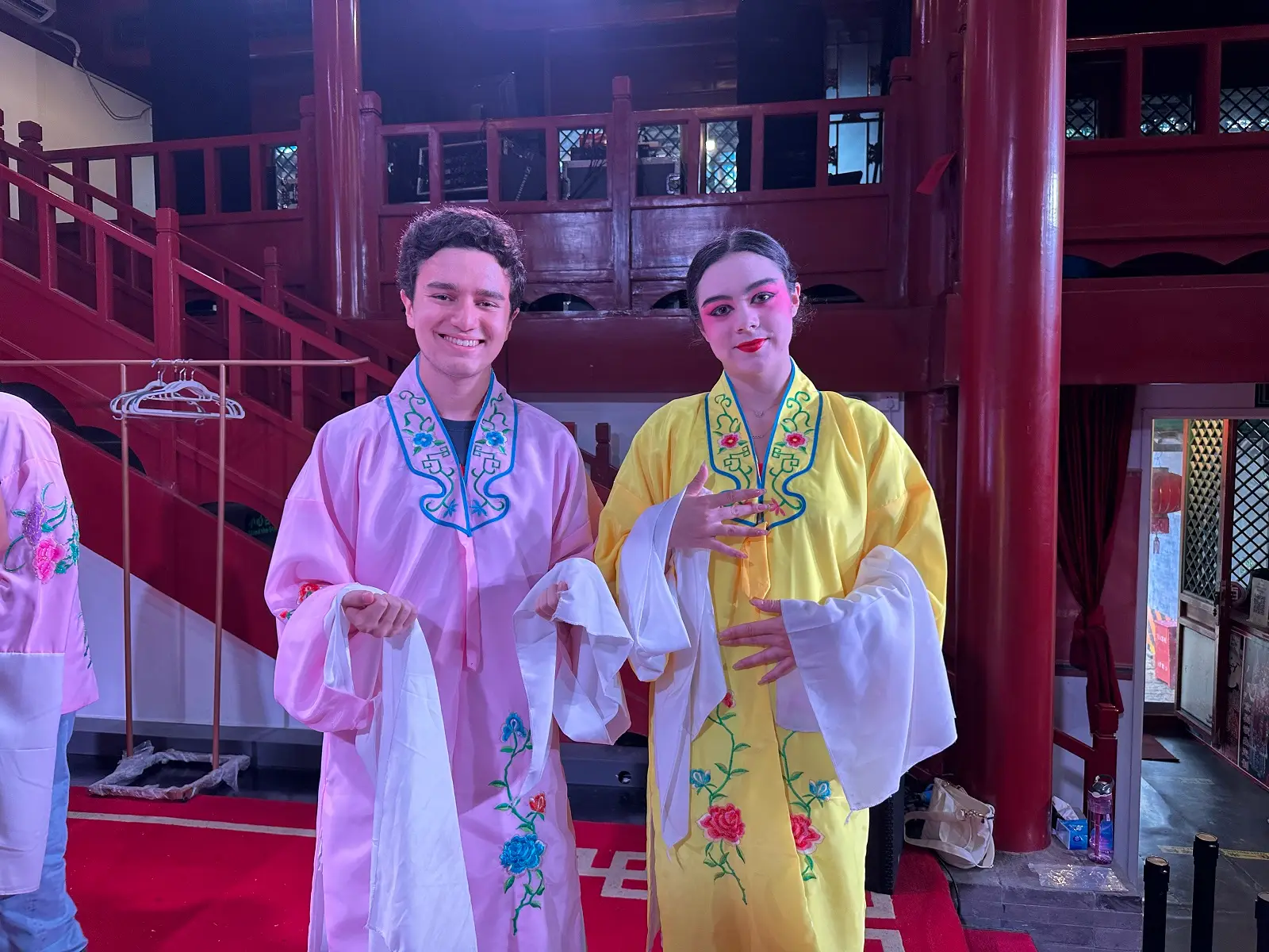 Me and 李安娜 (Lǐ Ānnà) trying out the elaborate costumes used in 京剧 (Jīngjù – Beijing Opera) performances. Wearing these traditional clothes gave us a deeper understanding of the artistry and cultural significance of Beijing Opera.