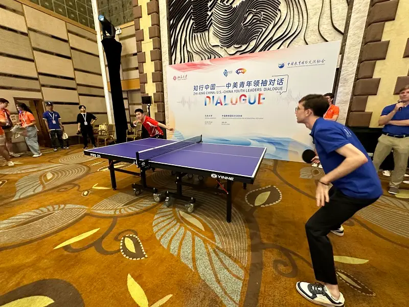 One of our CET friends playing ping pong with the 北大 (Běidà) Ping Pong team. This classic US-China ping pong diplomacy moment was a lot of fun and highlighted the spirit of friendly competition and cultural exchange during the 知行中国:中美青年领袖对话 (Zhī-Xíng Zhōngguó: Zhōng-Měi Qīngnián Lǐngxiù Duìhuà – Zhi-Xing China US Youth Leaders Dialogue) event.