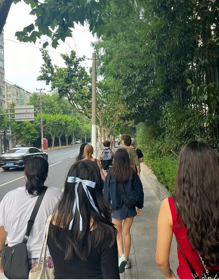 A view from orientation—a Shanghai city-walk with CET classmates and (some) local roommates. We walked the streets of Shanghai, guided by our program director, Jeremy. We got the rundown on the weather, the elderly dancing in public parks, the best places to eat or get coffee, traffic rules, amenities like rentable bikes, and more.