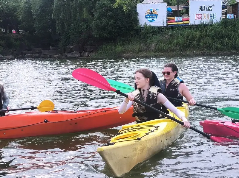 To cool off, CET staff and students reached a beautiful lake and kayaking destination after the long hike, tall islands and green bamboo waiting in the distance. We teamed up two per kayak: whoever was able to catch the most balls thrown wouldn’t get tipped over! But who wouldn’t want to get in a lake as warm as bathwater? We were tipped several times, gladly.