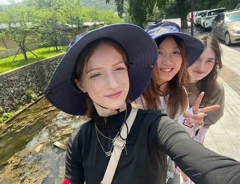 Me, my roommate, and a CET student (one of our friends) Victoria. Here, we are getting ready to climb a mountain in Ningbo with everyone. It was scorching hot, at about 87 degrees! I could only keep my jacket on for about half the way. The sunburn didn’t matter anymore! Vibrantly green trees, blue sky, and turquoise water lead our way to the peak.