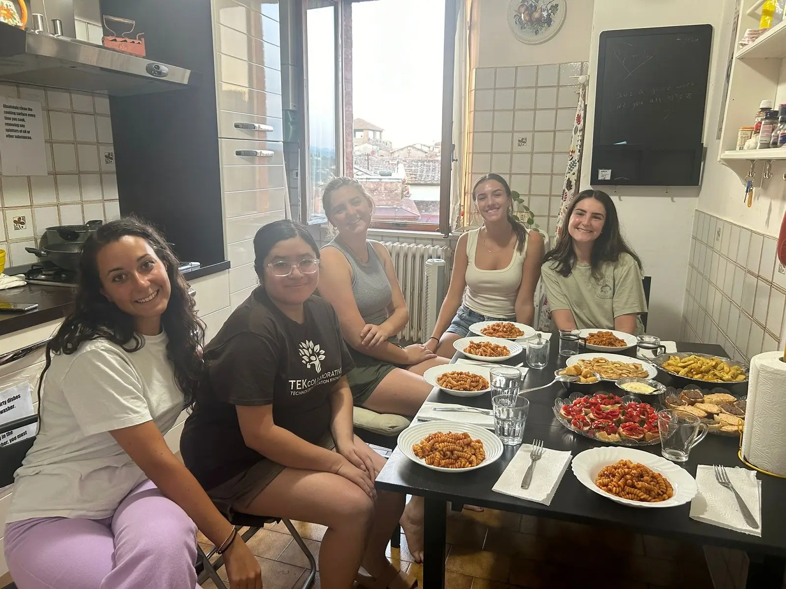 The transition was very smooth as CET instantly had activities planned for us. The first weekend was jam packed, including a visit to an alpaca farm, watching and then eating fresh pasta at a Tuscan restaurant, and getting to know both our American and Italian peers. We all bonded (maybe a bit out of fear) when a friendly camel named Fausto tried to join our circle at the farm. He kept bumping his head into us as if asking for extra pets on the neck! It’s fun to exchange different traditions, superstitions, and food preferences coming from many parts of Italy and the US. Something as simple as “knock on wood” turned out to not be universal, as Valentina and Teresa taught us their Italian hand gesture to avoid jinxing something.