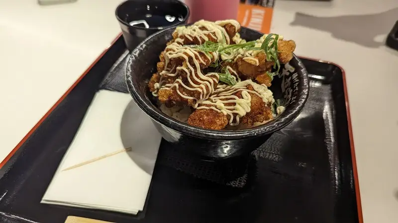 After wandering a food court for thirty minutes, I settled on a small bowl of karaagedon (fried chicken bowl). In hindsight, I probably paid more than I should have, but I was in the middle of the city.