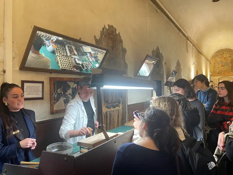 The leather here is molded by artisans who are studying to work with leather at high-end fashion brands, and even the daughter of the founder of the school is still creating her unique designs for the Scuola using high-end leather. We watched as a technician, who had worked there for over twenty years, applied a beautiful pattern of gold leaf to a leather coaster. Truly stunning. The only issue with this place is the price, as a coaster could set you back twenty-five euros and a jacket over seven hundred!