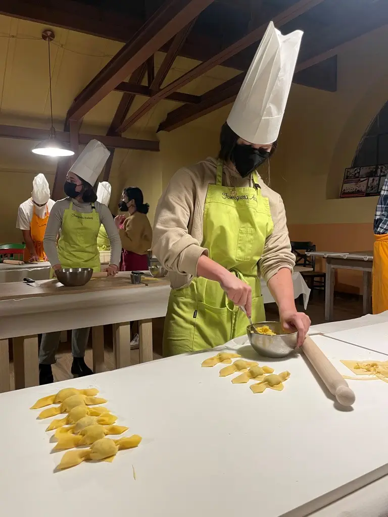 After many sandwiches and homemade dinners, along with a number of dinners out in Verona, Venice, Florence, and Rome the long-awaited cooking class has arrived. After a long day of classes, we went to Fonte Giusta which is the same restaurant that we attended for our first meal here as a group. Since that meal was so delicious and memorable, I immediately wanted to recreate it. We all walked in and received aprons and chef hats and got to creating the sauces. There were three different sauces – a ragu sauce, a cheese sauce and then a traditional tomato sauce. Each sauce was paired with a different pasta that we hand rolled and prepared which were a pici (a long, thicker noodle), gnocchi, and a ravioli stuffed with ricotta and spinach. After two hours of making the sauces and rolling out pastas and stuffing them it was time to eat it! Sitting down at the table and watching what you made come out of a professional kitchen is so rewarding. We all cleaned our plate each time the new pasta came out.