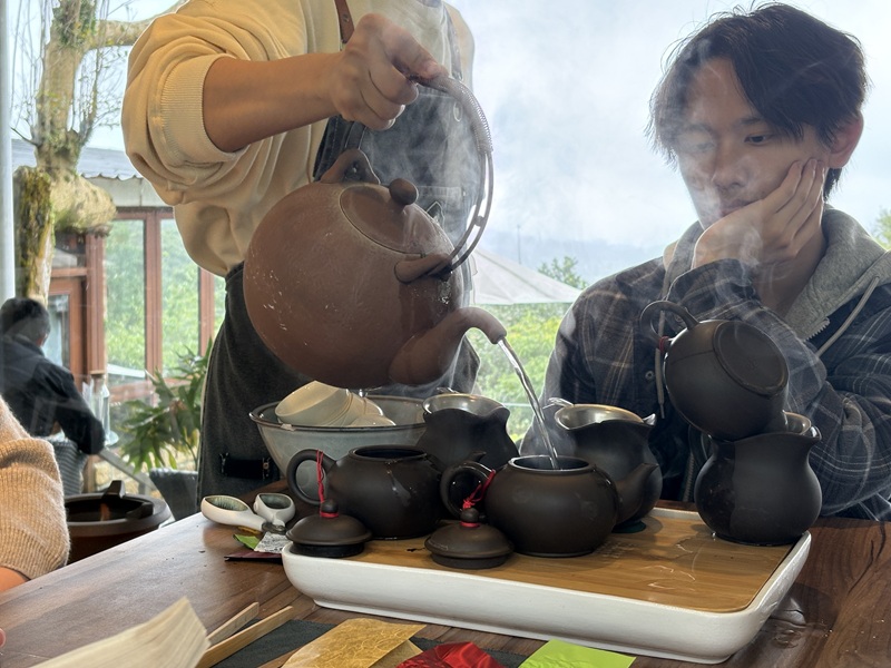 A light rain fell as we joined the line and huddled into our gondola. The seven of us, five Americans and two local roommates, took photos, sang karaoke, and laughed as we watched the rainforest go by. Our local roommate, Victor, pointed out his university in the foothills below. Incredible views of the Taipei skyline slowly disappeared behind successive curtains of fog and terrain as we became immersed in the greenery. Our other local roommate, Vivia, pointed out fields of the area’s tea trees, small greenish brown shrubs planted on carved shallow terraces, as we approached the top.