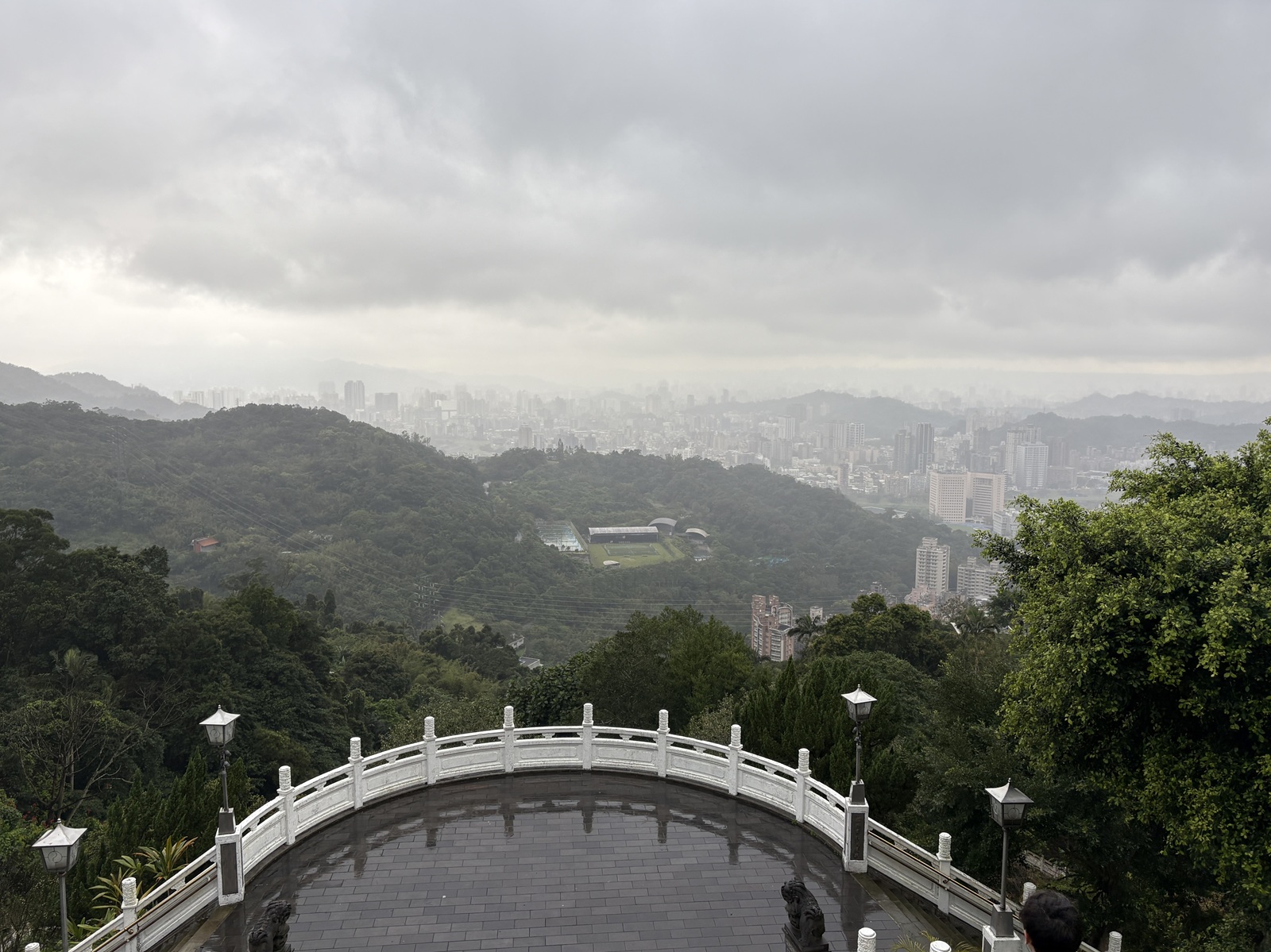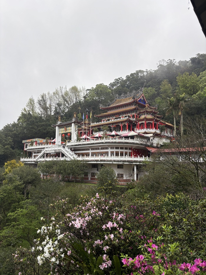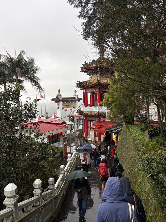 An hour in and we had reached the halfway point. Some of those who had their fill chose to take the gondola the rest of the way down. The rest of us continued on. Not even 200 feet down the path from the gondola station, we turned a corner and saw a fantastically ornate, bright red temple. The smell of incense joined the rain in the air as we approached. Vivia showed us how to appeal to this temple’s god for wealth-related fortune. The four of us left said a quick prayer and tossed the crescent 筊杯 (jiǎobēi), hoping for good news. Yet, the divination was clear: we would need to stick to our budgets for the time being.