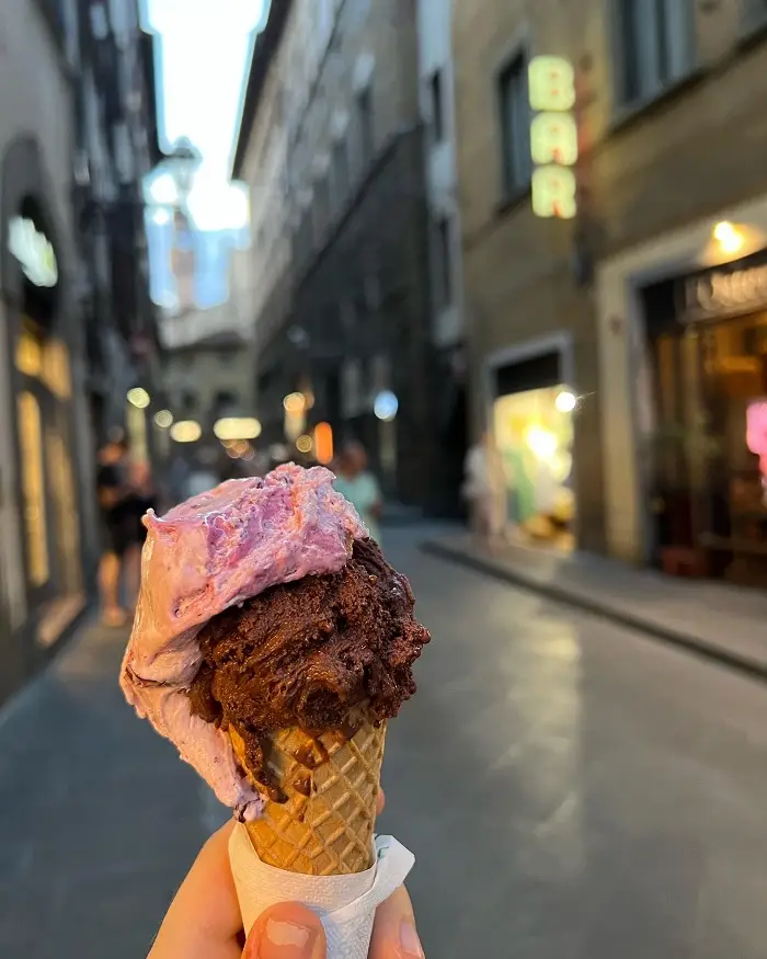 A classic! Vivoli is likely the most famous gelateria in Florence (so popular it even has a location in Disney), and it also holds the title as the oldest gelateria in the city. Before I went to Vivoli, I had heard raving reviews about the chocolate-orange flavor. As someone who adores all things with a chocolate/orange combination, I knew this would become another favorite. The balance of the rich chocolate and the fresh orange–including small pieces of candied orange on the top of the tub–make this a perfectly balanced fruit and chocolate flavor.