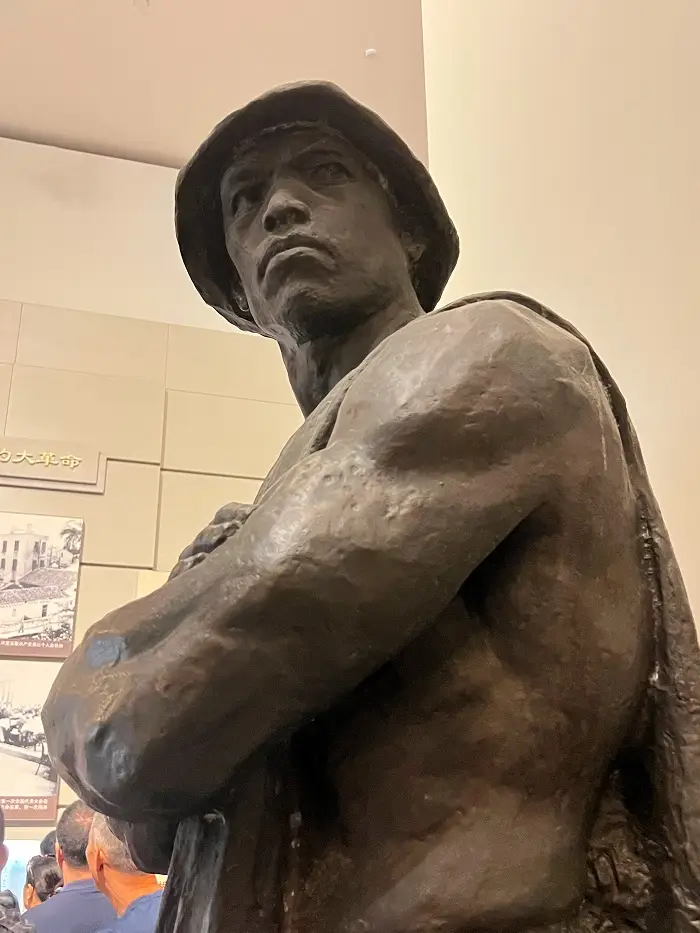 Step by step, we make our way up to the second floor, moving along the corridors of Chinese history. We pass by copies of uniforms used by revolutionaries, yellow-edged poems, and notices of people like the Hong Kong seamen protesting for their pay. After a certain point, I elect to move ahead of our pack and wander around the exhibitions by myself. Ahead of the tour guide’s voice, I try to read the different slogans and advertisements, noticing the changes in style and form of 20th-century texts.