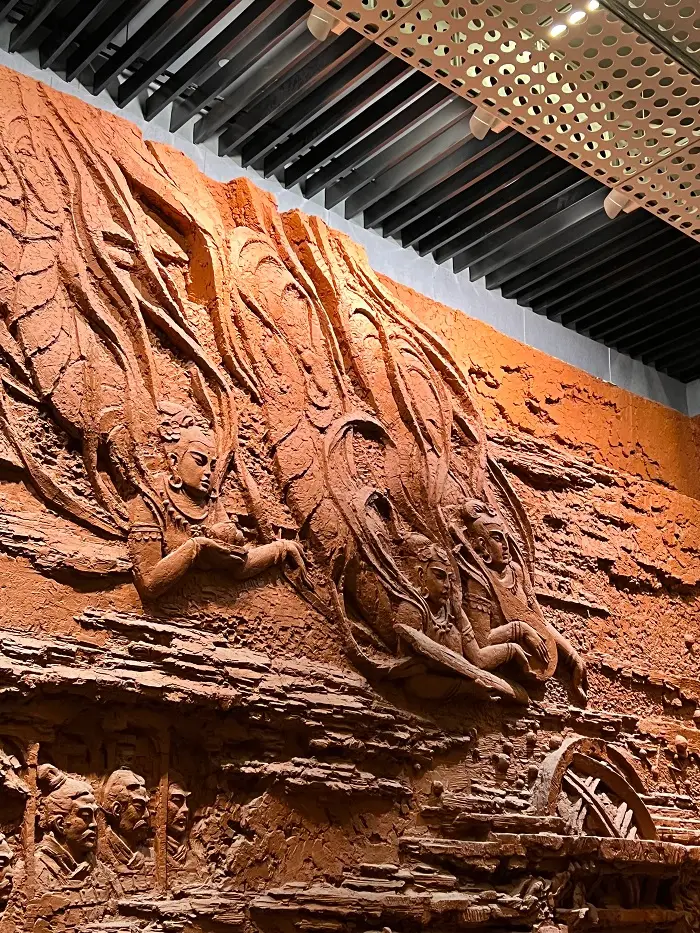Once inside the museum, we join other visitors and crowd around a tour guide, who begins to take us through an exhibition detailing the early history of China. The first room is empty, except each of the four walls are covered by the sculptures and etching of a crowded country, rife with wandering spirits, clouds, and mountain stones jutting out from the plains. Our tour guide’s voice sails across each relief in a clear and pleasant tone that we follow from room to room.