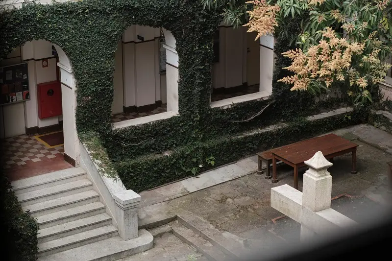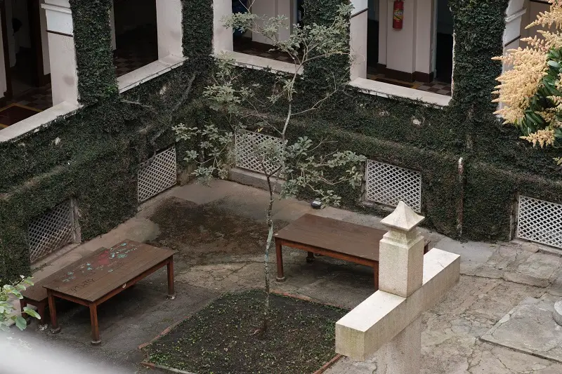 The center courtyard is indicative of the retro style the entire campus embodies—deep, muted colors, dense foliage, and old stone, plaster, and concrete. This older building used to be a convent for priests and nuns before it was converted into a university, and much of the religious architecture remains intact. The courtyard’s main focus directs toward the Cross, with picnic benches providing seats on one side only. This is to promote homage and avoid sitting with your back turned to the centerpiece.
