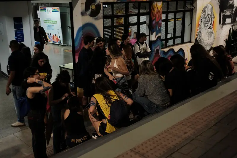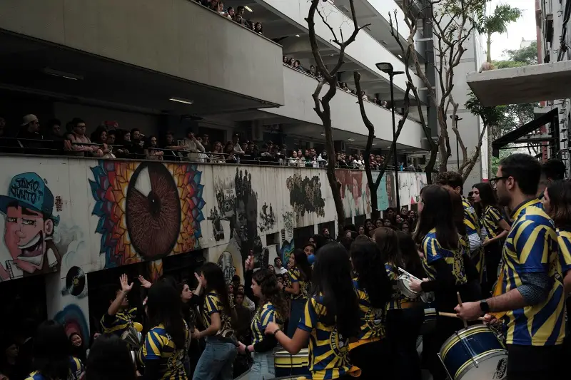 At the start of classes, there’s a tradition called “trote” for entry-level students, which may include raising money for charity and donation of materials like food or blood. Students gather in the courtyard called the prainha (small beach), where they can watch music performances by the different major departments. This drum show is called the bateria (battery), and there are several hosted throughout the day by the different departments. Older students paint newcomers’ faces with yellow and blue for the university’s colors, and huge banners fall from the balconies.