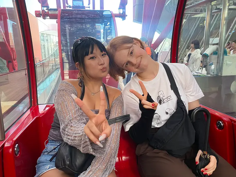 My housemates, Kamome and Charlotte, riding the red Hep Five Ferris Wheel that helps to color Osaka’s skyline. I thought being up so high was a bit scary, but these two weren’t scared at all. I was a bit terrified to get on the 75-meter diameter wheel.