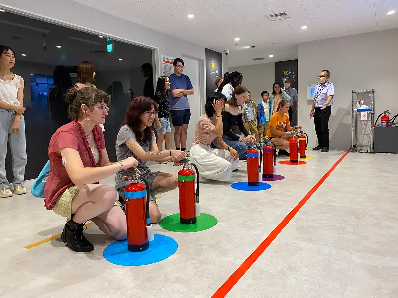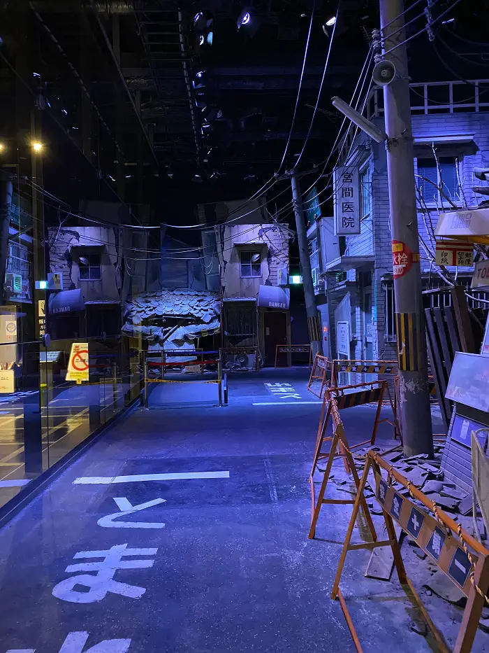 A fake scene of the destruction that follows an earthquake at the Osaka City Abeno Life Safety Learning Center. This room was so detailed and realistic that I was reminded of Disneyland-level theming and set building while learning about natural disaster preparedness. CET students learned to use fire hydrants at the Osaka City Abeno Life Safety Learning Center (right image). The fire hydrants aren’t real but are used in a simulator game that represents putting out a fire with one.