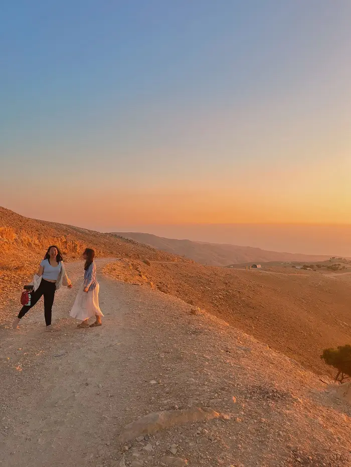 A picture of my friend and I laughing on a mountain road below mount Nebo. By the time we got there, the park was closed, but we got an even better view from where we were standing here thanks to our taxi driver. Little did we know we would get more tea with his family at his house. In the distance, you can see the Dead Sea.