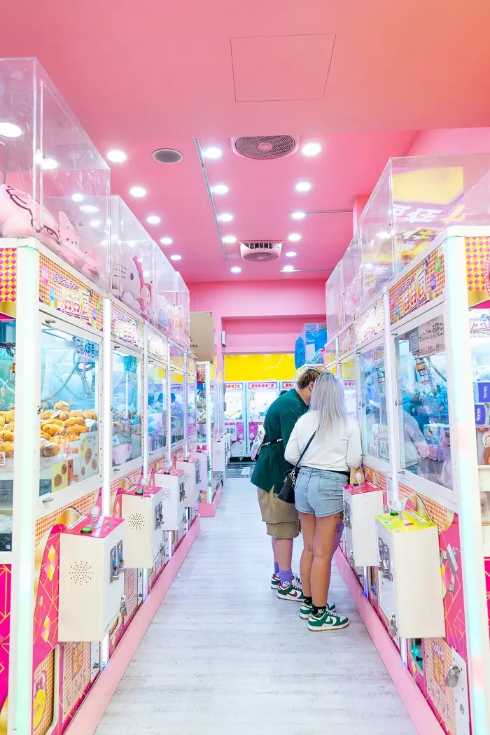 After school today, we went to Ximending, a trendy and popular shopping district with young people. All over Ximending are these open shops filled with claw machines and nothing else. Prizes range from packs of ramen to cute little stuffed animals!
