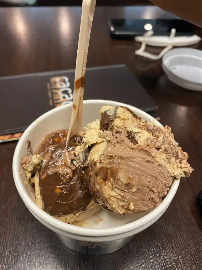 I forgot the name, but snickers like ice cream from Cacao Prague. Perfect to curve a sweet tooth at night. They close at 10:30.