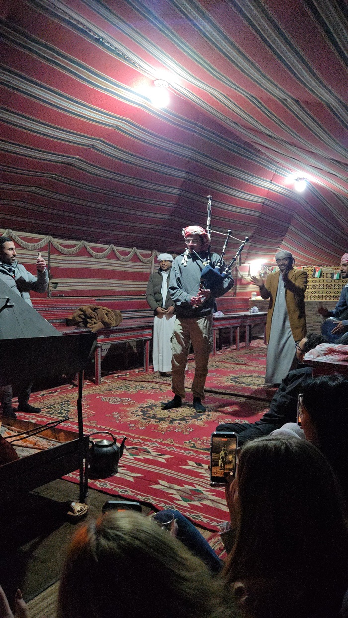 Later in the night, after we had put up the bagpipes and eaten dinner we spent a few hours listening to live traditional music and learning Dabke. It was quite dark in the tent and none of my pictures do it any justice but this was one of my highlights in Wadi Rum. None of us knew how to dance Dabke going into this and the guys in this photo started off pretty slow and hesitant. About five minutes after this was taken however, they were practically flying as one of our hosts led them around the circle. One of the many things that CET has taught me is that sharing culture is about more than just consuming differences, you have to be willing to actually participate and immerse yourself to be able to see a culture as it truly is, I hope that I succeeded in that during my trip to Wadi Rum and that over my travels this semester I can use the language skills I am developing with CET to truly interact with the beautiful cultures all around me.