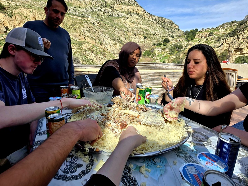 During my camping trip a few weeks ago one of the men hanging out with us invited us to his property for lunch and we were able to go this past Friday. Abd Al-Kareem—the many who invited us—was an amazing host and gave us a lovely afternoon on his property and in his town. The meal he prepared for us was Mansaf. Mansaf is a traditional meal throughout the Levant and the national food of Jordan. As you can see in the picture it is all served in one shared pan and eaten together with a group. Mansaf’s rich history in Jordan and the inherent community building aspect to eating it made this meal really special. As we were all eating we got to talk more with Abd Al-Kareem and learn about his life in Jordan and his family, we also got to talk more with each other and I got to learn new things about my fellow CET members that I did not know.