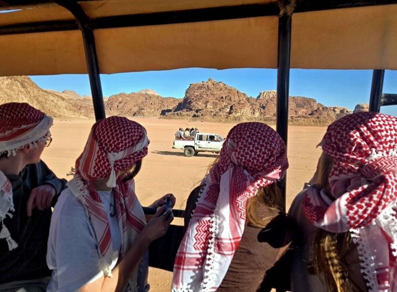 Over the last few weeks I have had the privilege of getting to travel all over Jordan and make connections with a ton of lovely people who were all super excited to share their culture and spaces with us. This first photo is from CETs trip to Wadi Rum and Petra. I took this picture riding on the back of a truck bed as we raced other cars of CET students to one of our many stops in the Arabian Desert. This trip was an amazing cultural experience and one I am incredibly privileged to get to do. Getting to see Wadi Rum with my cohort-mates and talk to the bedouins who live there was an unforgettable experience.